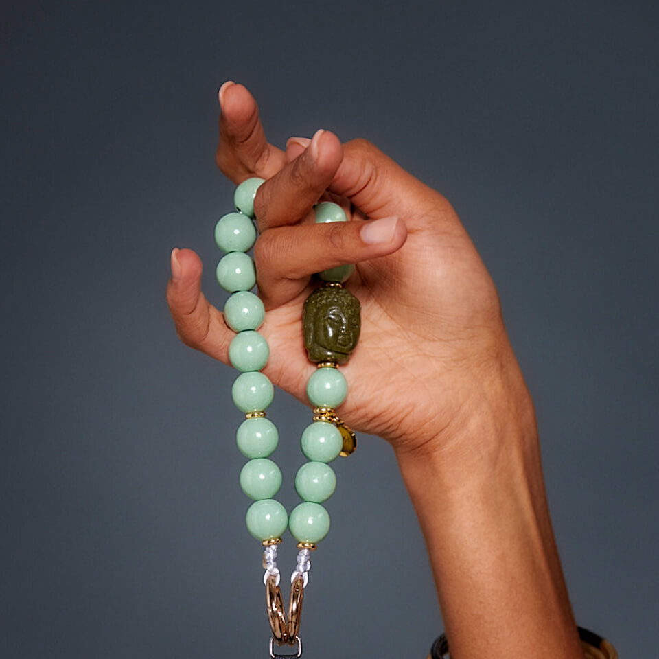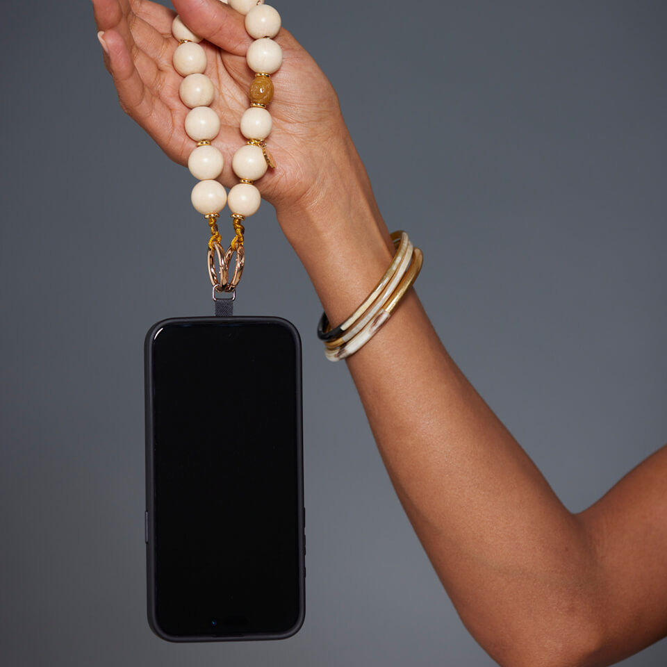 Hochwertige Handyketten aus Holzperlen und Edelsteinen auf farbiger Satinschnur aufgefädelt. Als Abschluss dient ein Federkarabiner.